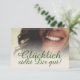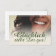 Kompliment Karte mit lachendem Frauengesicht und handschriftlichen Grüßen auf der Vorderseite der Karte. Restliche Flächen stehen zur freien Verfügung.