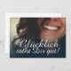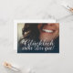 Kompliment Karte mit lachendem Frauengesicht und handschriftlichen Grüßen auf der Vorderseite der Karte. Restliche Flächen stehen zur freien Verfügung.