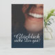 Kompliment Karte mit lachendem Frauengesicht und handschriftlichen Grüßen auf der Vorderseite der Karte. Restliche Flächen stehen zur freien Verfügung.