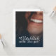 Kompliment Karte mit lachendem Frauengesicht und handschriftlichen Grüßen auf der Vorderseite der Karte. Restliche Flächen stehen zur freien Verfügung.