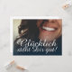 Kompliment Karte mit lachendem Frauengesicht und handschriftlichen Grüßen auf der Vorderseite der Karte. Restliche Flächen stehen zur freien Verfügung.