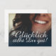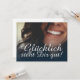 Kompliment Karte mit lachendem Frauengesicht und handschriftlichen Grüßen auf der Vorderseite der Karte. Restliche Flächen stehen zur freien Verfügung.