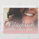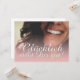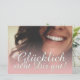Kompliment Karte mit lachendem Frauengesicht und handschriftlichen Grüßen auf der Vorderseite der Karte. Restliche Flächen stehen zur freien Verfügung.