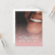 Kompliment Karte mit lachendem Frauengesicht und handschriftlichen Grüßen auf der Vorderseite der Karte. Restliche Flächen stehen zur freien Verfügung.