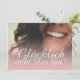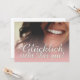 Kompliment Karte mit lachendem Frauengesicht und handschriftlichen Grüßen auf der Vorderseite der Karte. Restliche Flächen stehen zur freien Verfügung.