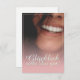Kompliment Karte mit lachendem Frauengesicht und handschriftlichen Grüßen auf der Vorderseite der Karte. Restliche Flächen stehen zur freien Verfügung.