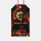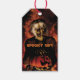 En häxa som håller en pumpkin. Flamor i bakgrunden. Orange och svart färg. Du kan anpassa texten till Spooky Gift.