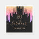 Ett trendig och en glamorös 50-årsdagars napkin. En klassisk svart bakgrund som dekoreras med regnbåge färgad faux glitter, färgdroppstift i lila, rosa och ro guld. Med texten: 50 och fantastisk. Anpassa och lägg till ett namn. Golden färgad. Ord Fabulous är skriven med ett modernt handskript i stil med dekorationer.