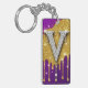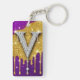 Gnistrande diamantprydd bokstav V mot ett fält av guldglitter med droppande metalleffekt och livlig lila bakgrund, som frammanar lyx, glamourös monogramstil, firande och högklassig bling.