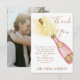 Vår bubblande champagne tackkort har en modern design med en falsk guld champagneflaska. Lägg till ditt favoritfoto på baksidan av kortet och du är klar. Detta kort är det perfekta sättet att uttrycka din uppskattning till dina nära och kära som har hjälpt till att göra din förlovningsfest ännu mer speciell. Matchande föremål i butik Bigoldsoul