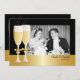 Fira det lyckliga paret med ett originalbröllopsfoto på framsidan av denna underbara svarta och gyllene inbjudan. Detta 50-års bröllopsjubileum har eleganta champagneglas med gnistrande bubbel, prydligt bundna med glänsande gyllene band för att hedra deras gyllene jubileum.