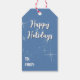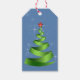 Modern julgran med grön banderoll, röd stjärna och vita glittrande gnistor på vinterblå och vit prickig mönster.