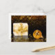 Glamourös, modern och professionell gyllene julillustration med en vit presentlåda med gyllene julhälsningar, en gyllene julgranskula och gyllene pärlor på en ädel gnistrande gyllene bokeh-bakgrund.