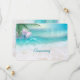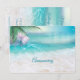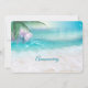 Bröllopsannonsering för strandbröllop | Strandbröllopstema. Vackert glänsande klart havsvatten som glittrar i solljus, vit vattenfoam på den rena sandstranden med en palmkvist och ljusrosa blomma pryder hörnet Lugn eller formell, för ett strandbröllop eller destination öbröllop