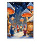 Gnomer i en snötäckt svampgårdsplats som firar med helgdag och gemenskap med en liten varmt upplyst vingård och utsökta helgdag och frukter. Inuti står det "Season's Greetings"!