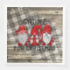 Gnome rustic land helgdag bondhus med tre vackra Gnomes i röda tröjor med Gnome För jul på en svart och vit plaid och rustik träbakgrund.