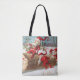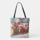 Funny vintage Christmas illustration of little white bearded gnomes dressed like Santa, dragging a cut tree trunk through the snow. Published by L. Prang & Co.
