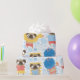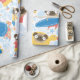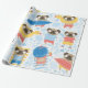 Gnugga på semester. mönster med tecknad på stranden. Hundar i sommarkläder. Barn mönster med puggar som äter glass, skridskor, surfing, lägger på stranden, solbadar.