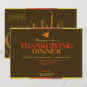 Färgglad Gobble Gobble-text i orange toner och vit på en mörkbrun bakgrund. De övre och nedre kanterna har ett fantastiskt randigt mönster i varma röda, orange och gula toner, perfekt för höst- och thanksgivingfirande och högtidliga postutskick! Baksidan av inbjudan visar din festinformationstext och ett bladutskär på toppen. En fantastisk inbjudan till thanksgiving eller höstfest.