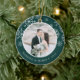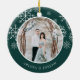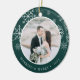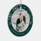 Elegantens fotojulprydnad för nyfödda har ett bröllop-favoritfoto på vardera sidan, inramat av vit snöflingor på jägergrönt. Anpassa med en anpassningsbar på vardera sidan som visas med "Merrily All After" på framsidan och namn på baksidan.