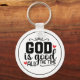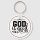 Religious typography "God is good all the time" with two red hearts, and curled lines and scroll work, with a round black border. Customizable name on the back.