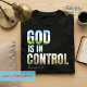 Faith-based Christian design featuring “God is in Control” nature typography with watercolor florals and mountain scenes. Inspirational apparel for women, perfect for gifts, spiritual motivation, and everyday wear.