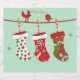 : Ett festligt flaska i vin med en helgdag-temad märkning med färgstarka julstrumpor hängande på en klotelin. Varje lager har ett unikt mönster i rött, grönt och vitt, vilket ger en munterhet. En liten fågellips på linjen, som stärker den mysiga, känner helgdag. Bakgrunden är ljus och mjuk, skapar de pulserande lagren utmärker sig, perfekt för gåva under julhelgen.