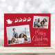 Festivt rött helgdag-kort med 2 bilder utspridda i vit ramar, en vit silhuett av renar som flyger tomtens sleigh, "God jul" i ett snyggt vitt skript och ditt namn i vanlig modern vit typografi.