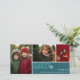 Lägg till 3 foton till det här Helgdag-fotokortet. Den moderna snöflummen och blå färg gör detta till en färgstark jul hälsning. Ett rödblått mönster är på baksidan.