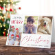 Modern helgdag-uppvikt hälsningskort med 3 fotokollage, "Vi önskar dig mycket God jul" i en blandning av enkel typografi och ett rött skript i eleganten och ditt namn och året. Lägg till personligen med ett första namn eller annan text på insidan.
