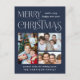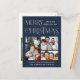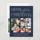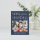 Blått vykort för elegant med "God jul" i snyggtens vintage, vit typografi, "gott nytt år" och hälsning i modern vit typografi, tre av dina favoritfoton och ditt namn. På baksidan lägger du till ett fjärde foto och anpassar ditt säsong-meddelande till familj och vänner.
