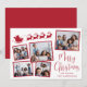 Festivt helgdag-kort med 5 fotokollage av utspridt bilder i rött ramar, en röd silhuett av renar som flyger tomtarts sligh, "God jul" i ett rött skript för snyggt och ditt namn i enkel modern röd typografi.