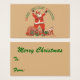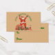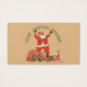 Vintage julillustration med en glad tomte med långt vitt skägg och hatt. Tomten står med armarna i luften och runt omkring honom finns julleksaker (häst, docka, clown och boll) medan han ropar God Jul Alla!