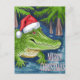 En vattenfärgad illustration av en grönt alligator som bär en julhatt. Alligatorn är i en båt med Cypress träd. Det finns en text som säger "God jul".