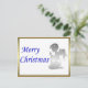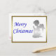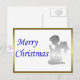 En elegant julkort med en bön, silver ängel bredvid ett God jul-meddelande i blått, omgiven av ett gyllene ram.