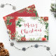 God jul Blommigt Helgdag Card. Det här vackra helgdag har vattenfärgade röda blommor med elegant och grön mot vit bakgrund med God jul i röd text. Kortets baksida innehåller samma teckningar, men på en röd bakgrund med text för anpassning.