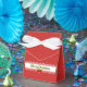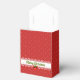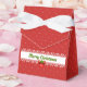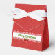 Festive-ruta med en röd huvudbakgrundsfärg och ett mönster av små vita polkapunkter. Över framsidan finns ett vitt lace-effektband med orden God jul i gröna bokstäver med röd skugga. Under bokstäverna är en röd båge med tre gröna hollblad och röda bär.