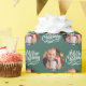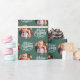 Fotoinslagning papper, personlig med bild och hand med God jul i borstad kalligrafi. Fotomallen har ställts in för att visning bild i rund form. Om du har problem med placeringen i bild kan du prova att beskära fotot till en kvadrat och ladda upp det på nytt. Bakgrunden till färg är grönt som du gärna vill ändra (klicka bara på "redigera med designen verktyg").