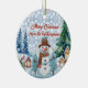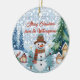 Den här anpassningsbarna har julprydnaden en gammaldags scen av en snöby, som förenar Evergreen träd, en charmerande by, och ett viskigt snögubbe. Snögubbe, med sin röd och grönt randig karf, morotnäsa och top hat, ser ut som om han var gjord av faux embroidery. Text längst upp om anpassadet är helt, så se till att anpassa den med ditt namn och/eller annat meddelande.