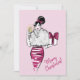 Bekvämt ritad illustration av mode mot en rosa bakgrund. Med ett glas champagne i ena handen och Julklapp i den andra vill hon fira jul med er och skaka till ett gott nytt år.