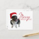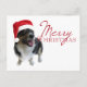 Ett vackert helgdag vykort för hundälskare, med en vacker pembroke welsh corgi med en röd tomhatt. God jul är skrivet i rött bredvid det söta bild.