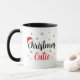 Modern och söt jul Cutie mugg. "Jul Cutie" är i en underbar röd och svart modern manustypografi med en julhatt som hänger på julens "Ch". Omgiven av charming snöflingor. Sitt något varmt medan vi bär vår matchande t-shirt eller apron!