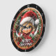 Den här charmerande illustrationen visar ett sött barn med ljusblått ögon, som bär en julhatt och en rödhårig jacka. Hon håller på att söka sig bakom en snöig julandedräkt som dekoreras med pinekoner och hullbär. En banderoll vid grund lyder "GOD JUL" och skapar en glatt och festlig utformning av helgdag.