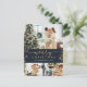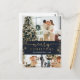 God jul vykort med returadress med multifotokollage (4/4 bilder), faux guld foil handskriven kalligrafi och bokeh gräns mot mörk blått bakgrund. Anpassa enkelt med bilder, färg och text som du vill ha med dig. Obs! Om du vill justera subjekt på fotona (grund) skriver du in designen verktyg, markerar fotot och väljer skörd verktyg. Flytta där upp eller ned och välj önskad plats.