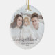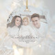 Sprid helgdag till vänner och familj med denna moderna keepéprydnad. Grått-texten från kol lyder "God jul" med dekorativa dekorativa dekorationer före och efter. Byt ut exempelbilden mot ditt favoritfoto och lägg till familjen namn och året. Ett vitt övertoningsfilter hjälper till att göra så att texten visas.