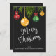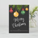Gör helgdagarna ljusare med detta julkort som innehåller färgstarka dekorationer i rött, guld och grönt som hänger från evergreen grenar mot en fet svart bakgrund. Den glada familjen God jul hälsning och personlig namn gör det till perfekt att skicka varmt önskemål till vänner, familj och medarbetare. Ett val av snyggt för var och en som i kärlek utformar den moderna helgdag med pulserande poppar från färg.