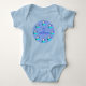 Den här söta baby t-skjortan har en söt liten grått och vit penguin med beady Black ögon och gult Bak och fot. Penguin håller en stor blå fisk med en flipperfisk och står på en blek blå istelopp. Det finns en öppen present bredvid penguin med ett festivt band.