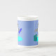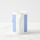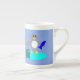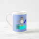 Fantastisk espresso mugg har en söt liten grått och vit penguin med bekant svart öga och gult och näsa. Penguin håller en stor blå fisk med en flipperfisk och står på en blek blå istelopp. Det finns en öppen present bredvid penguin med ett festivt band.