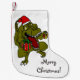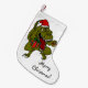 Rolig en iklädd tecknadTrex dinosaur en Santa hatt med presenter