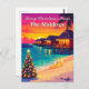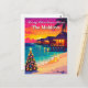 Skicka varma julhälsningar från paradiset! Detta vykort visar en strålande tropisk solnedgång, övervattensbungalower och ett festligt strandjulgran — den perfekta tropiska twist på högtiderna.